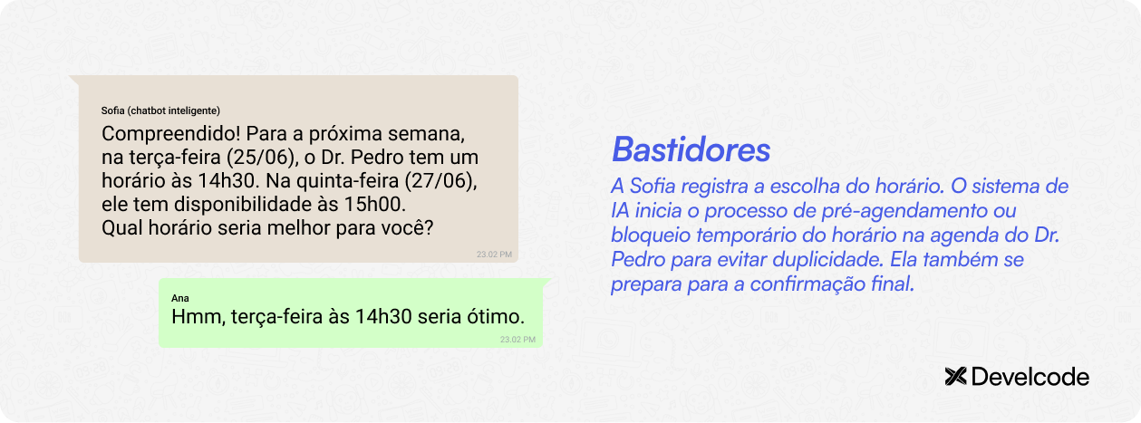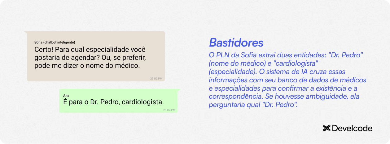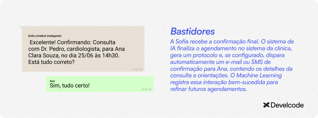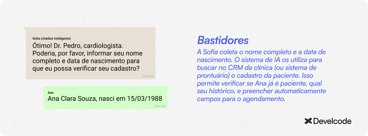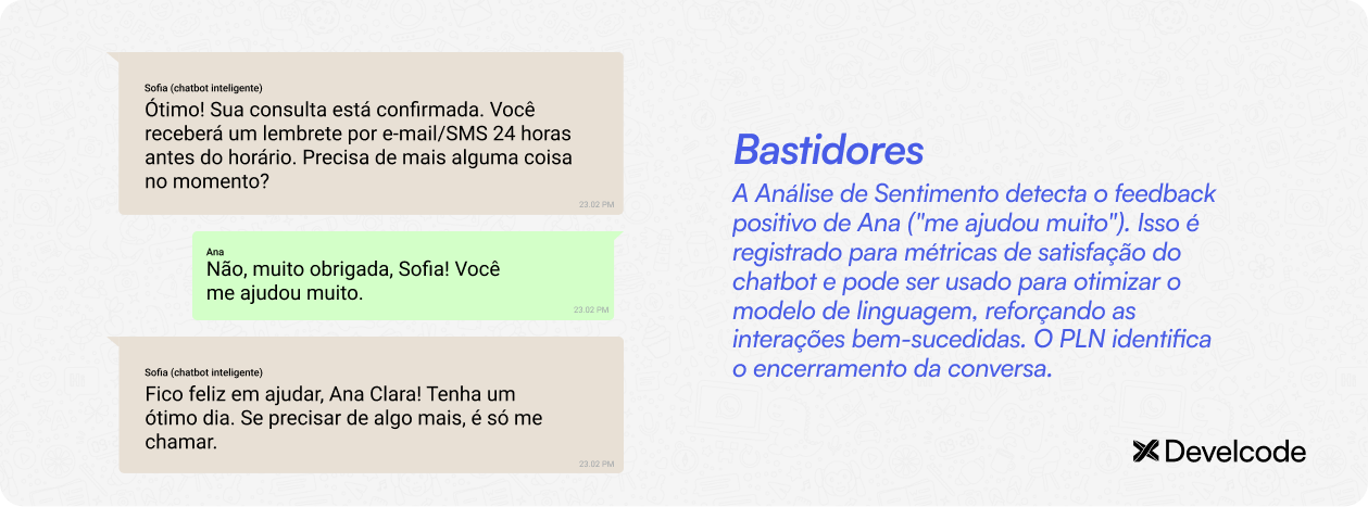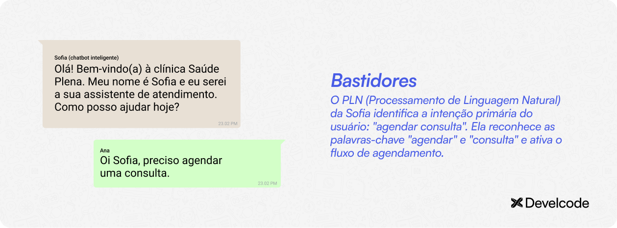 Para trazer o exemplo de um chatbot inteligente em ação, vamos simular a conversa entre a Sofia (chatbot com IA da clínica Saúde Plena) e a paciente Ana.