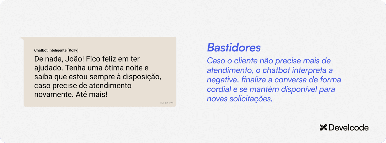 Encaminhar atendimentos apenas quando necessário: Quando a questão é mais complexa e exige um toque humano, o chatbot faz o encaminhamento inteligente. Ele já colhe as informações essenciais e as repassa ao atendente, que assume o contato já com o contexto completo, otimizando o tempo de todos. Já quando a IA do chatbot consegue resolver a situação, ela pode concluir o atendimento após atender à solicitação do cliente e gerar os devidos registros, sem precisar ocupar os atendentes humanos.