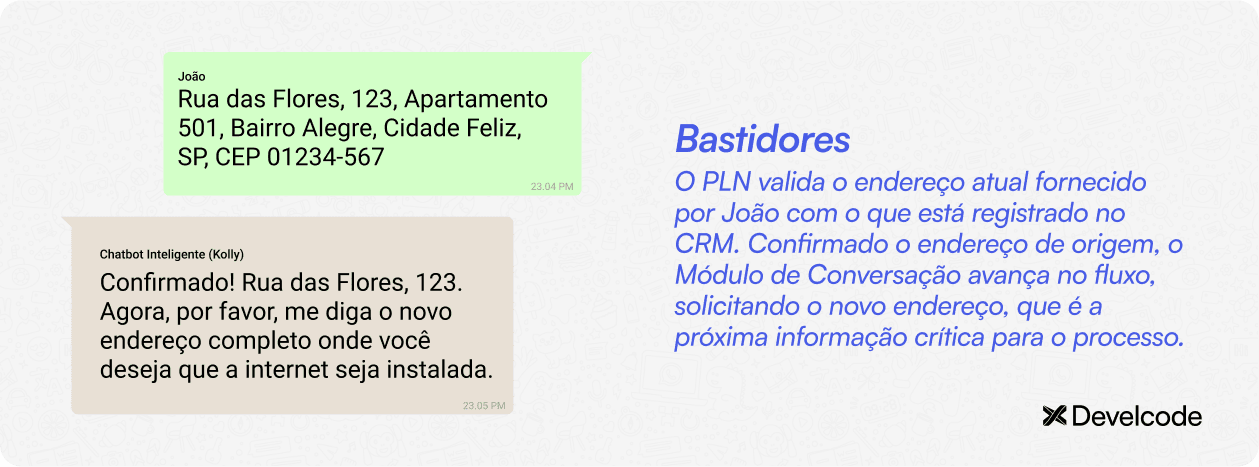 Compreender a intenção: Mesmo com uma frase simples como "preciso mudar o endereço", o chatbot interpreta a necessidade do cliente.