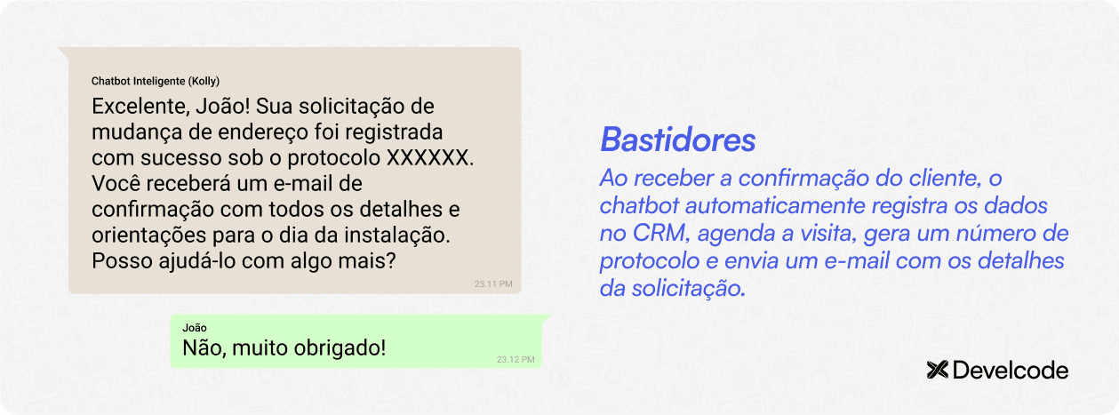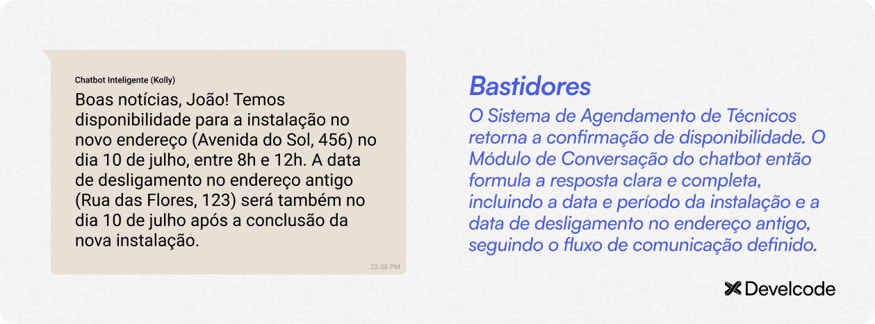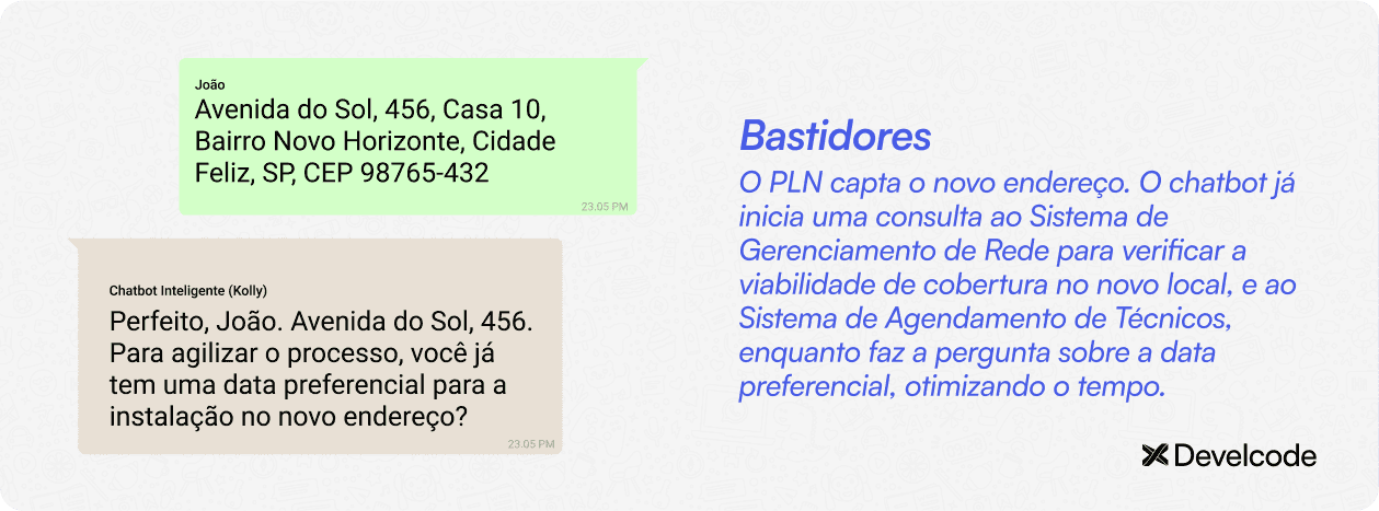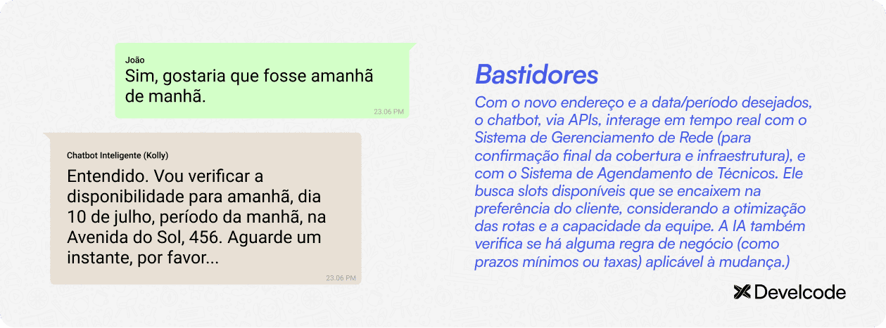 Acessar e processar dados em tempo real: Isso inclui verificar a cobertura no novo endereço, a disponibilidade de agendamentos e até mesmo o status da conta do cliente.